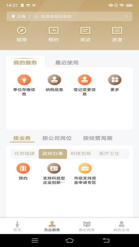 “随申办”企业云是一款面向企业用户设计开发的政务APP,重点关注法人全生命周期,面向企业法人,实现企业法人在移动端办事的统一身份认证,提供企业开办、纳税缴费、项目申报、年检备案、政策推送等办事服务;面向企业经办人员,依托授权体系,通过实人认证和企业认证后,以授权根据不同角色经办人员在线办理企业相关业务;面向非企业代表人及经办人员,提供查询政策查询、互动交流、咨询浏览等服务。