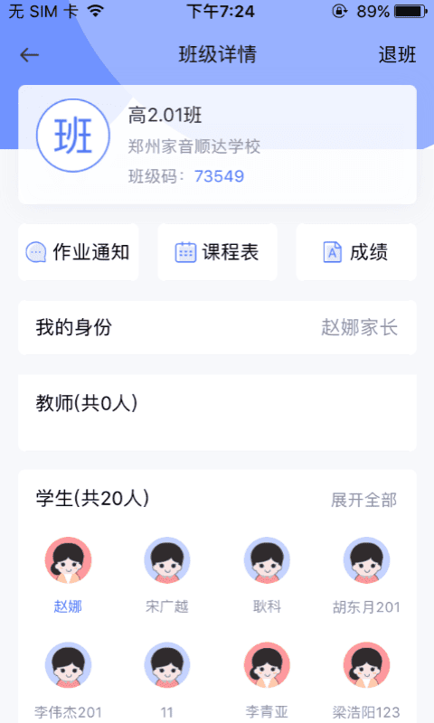 在青于蓝的班级群,可以查看作业通知、课程表、老师信息和班内成员等信息,但却不能群聊。因为在设计之初,青于蓝就刻意规避了群聊功能,从而有效屏蔽无用闲聊,减少家长与老师、家长与家长因在群聊中措辞不当产生的各种矛盾。