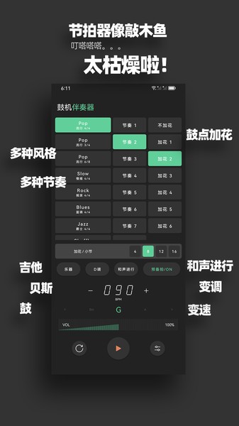 2、支持吉他、贝斯、鼓等乐器,提供多种风格、多种节奏,自由变速、变调,进行和声