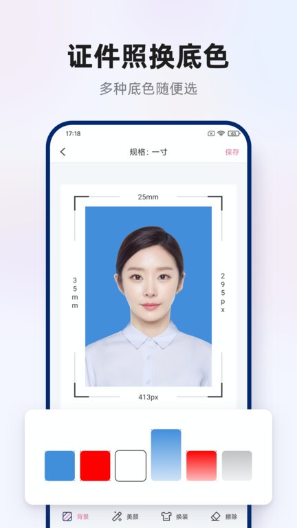 智能证件照拍摄手机版几种常用的背景色以及尺寸可供选择,通过在线拍摄或是第三方上传的方式来得到照片底稿,然后根据个人所需来编辑出一个完整的证件照即可,整体操作方法十分简易,新手也能很好的进行使用。