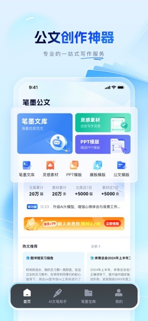 笔墨写作,原笔墨公文APP。一款专为公务员、学生、教师和职场人士打造的AI智能写作APP。笔墨写作基于定制化大模型技术,能够为你高质量生成专业的公文内容、学生论文报告作业、教师备课教案等,提升写作效率。