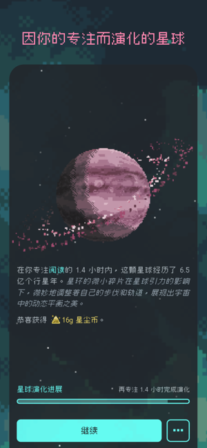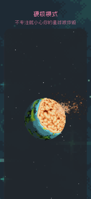 每次专注后,你会看到在专注过程中这颗星球发生的故事。即使只专注了五分钟,对你的星球来说也是 3853 万年的演化,所以你的专注至关重要。想加大放弃专注的筹码?你可以开启“硬核模式”,专注失败可能导致你的星球被炸毁哦!