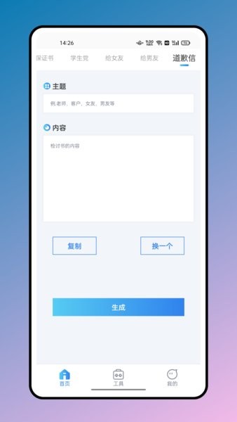 超级好用的检讨书自动生成软件,用户通过这款软件可以快速的生成检讨书,各种不同的场景都可以设置主题内容,生成的检讨书声情并茂,绝对能够打动对方!