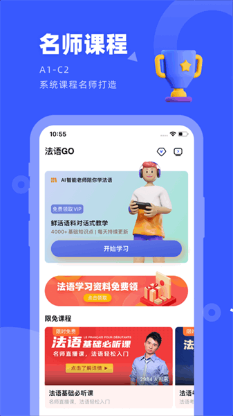 法语go是非常实用的教育平台,用户下载app之后就可以在线搜索法语课程,丰富的内容可以满足不同水平用户的学习需求,语法、文化、单词等等专项课程帮助大家打好学习基础。还有课后云辅导、练习帮助大家巩固提高,赶紧下载法语go app使用吧。