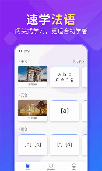 法语入门app是一款适合法语自学者使用的学习软件,包含了详细的字母发音表、音频教学、听力、语法等内容,课程由易到难,帮助大家循序渐进学好法语,欢迎下载体验!