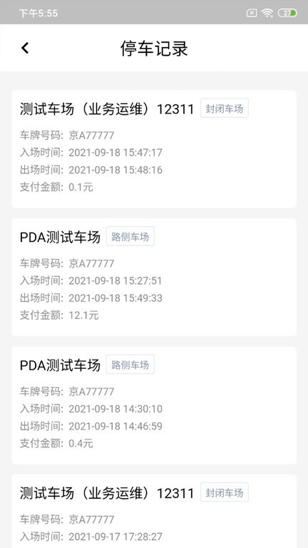 4、停车记录:显示我的停车记录,显示状态(在停、欠费、正常缴费),可进行缴费补缴