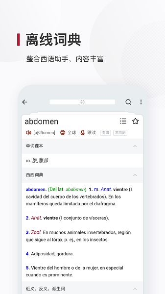 1、多功能单词展示工具,让用户轻松积累更多西班牙词汇。