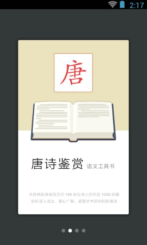 唯一正版《唐诗鉴赏辞典》App,专为大中学生、语文工作者以及古诗词爱好者量身定制,帮助学习者准确、高效地理解古诗词知识、品味古诗词文化、提高古诗词鉴赏能力。