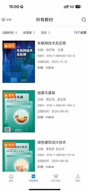 -- 用户可在底部导航栏中查看APP内全部教材,或各大合作院校使用教材的情况。
