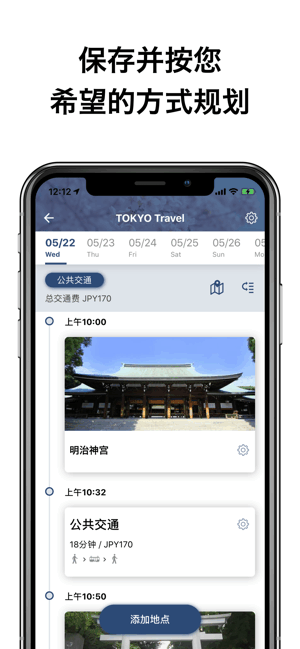 -- 通过在时间轴中添加收藏夹中的地点,创建您自己的旅行计划。在地图上也可以查看您的计划。