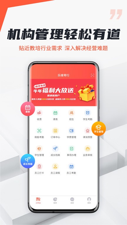1.实时推送上课提醒、考勤通知、课程调整等信息,方便家长及时了解教学情况和学生动态;