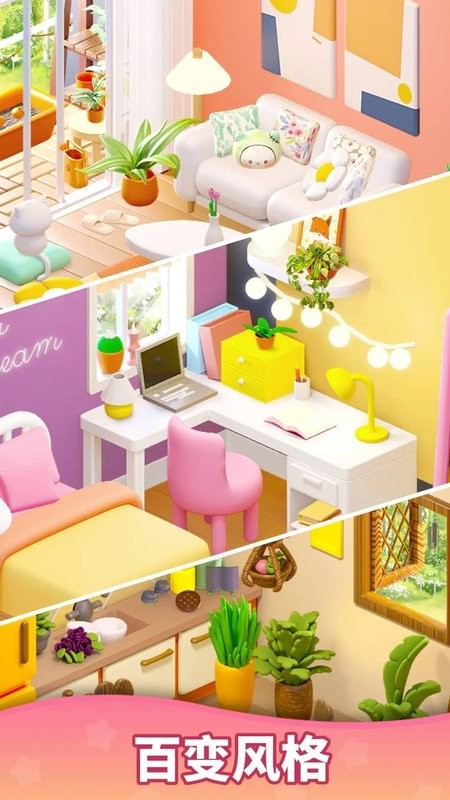 1、打造梦想中的家装房屋,多种装修风格,丰富多样的消除关卡,设计和装修你的梦想家居