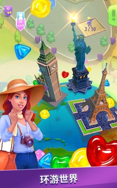 《糖糖大世界》是一款结合了三消玩法和旅行主题的休闲游戏。游戏中玩家可以扮演旅行者和导游的角色,通过消除软糖来重建世界各地的城市地标,比如纽约的自由女神像、巴黎的埃菲尔铁塔等。游戏提供丰富的关卡和有趣的任务,玩家可以在全球100多个城市中挑战自己,完成任务后还能收集邮票和照片装饰护照。