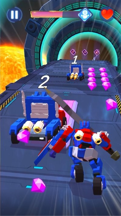 汽车人变形热血赛车是一个将赛车与机甲变形玩法相结合的趣味手游,游戏中玩家可以解锁不同外形的机器人战士,进入赛道之后它们就能随意变身为汽车来奔驰前行,其中还融入了跑酷元素,玩家需要灵活控制汽车人捡到路上的钻石和道具哦!