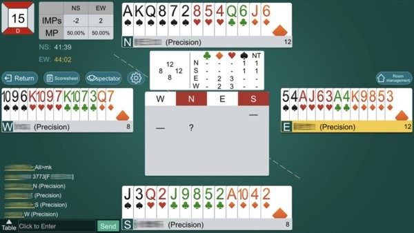 点击”进入”, 即可直接进入到比赛牌室, 并自己选择就座位置. 示例如下图: