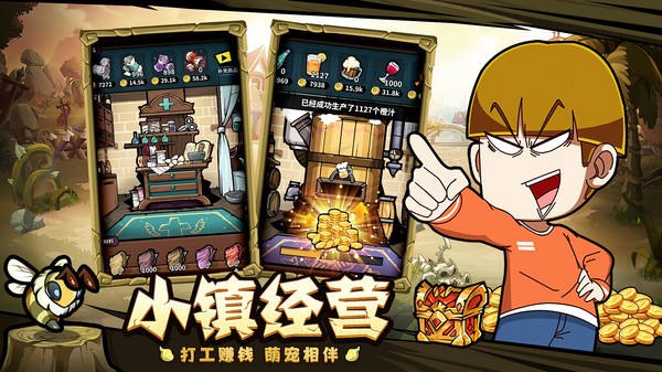 这是一款结合了卡牌放置和模拟经营的休闲冒险游戏。小镇里有着众多为生活奔波的英雄,合理地安排他们将为小镇储备更强战力和不断上涨的金币!当然,生活也不可能只为了金币,派遣英雄冒险、收集材料打造装备和英雄们交易、解锁新区域和建筑、丰富小镇生活……