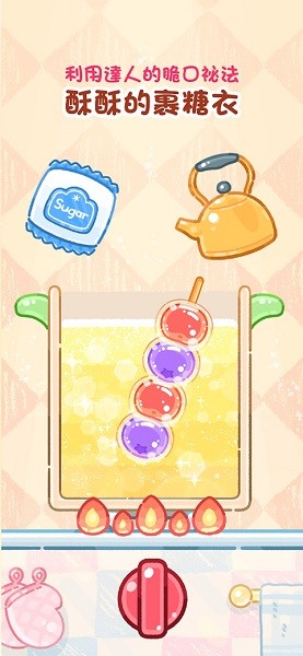 玩法简单又有趣:你需要用新鲜水果和特别材料(比如松饼、软糖)串成糖葫芦,然后裹上薄脆的糖衣。通过完成任务和挑战,解锁更多材料和关卡,还能提升等级,赚取金币。画面设计超级可爱,加上舒缓的背景音乐,让人心情放松。