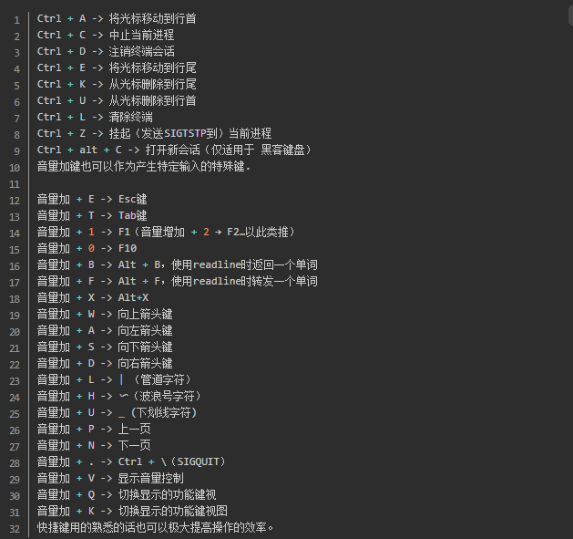 Ctrl键是终端用户常用的按键,但大多数触摸键盘都没有这个按键,因此Termux使用音量减>小按钮来模拟Ctrl键。