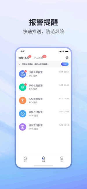 3、丰富的消息提醒,设备监测到的移动侦测、区域入侵等各类告警信息及时推送至App上,从此不错过每一个监测到的异常情景