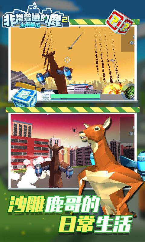 非常普通的鹿2未来都市手游是玩法精彩纷呈的趣味动物模拟游戏,大家可以化身天不怕地不怕的沙雕鹿哥,在城市中展开自己的破坏事业,用自己的角来造成无法估量的伤害,展现自己在搞坏事上无所不在的天赋吧!