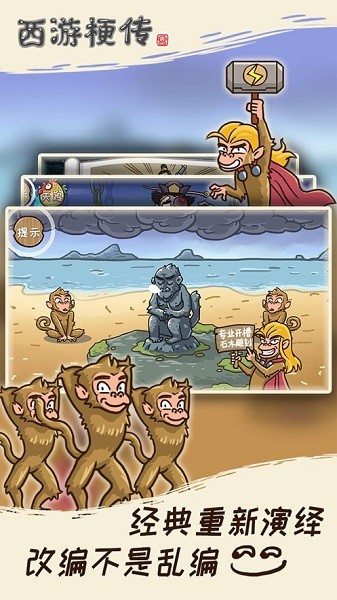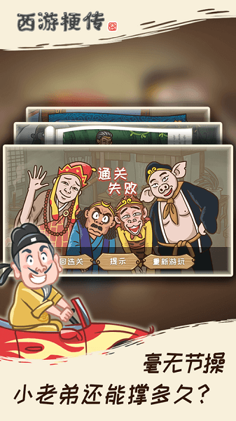 这是将现代梗与经典名著相融合,用脑折磨玩家,用心服务脑细胞的正经解谜游戏。请高速运转你的小脑袋瓜,保持足够的理智与清醒去帮助取经5人组渡过九九八十一难。