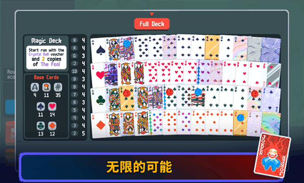 -- 玩家可以通过多种方式进行抽牌和开卡包,以此来升级自己的扑克牌和牌型。此外,游戏中的小丑牌相当于遗物或装备,能够为玩家带来各种特殊能力和增益效果。通过策略性地组合和升级,玩家可以形成独特的Build,以大幅度提高筹码数和倍率,进而获得更高的得分。