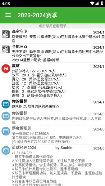 篮球经理2024强制交易版(basket manager 2024)是一款以文字玩法为主的篮球经营游戏。玩家的角色就是球队经理,选择一支你喜欢的篮球队开始管理了,不满意的球员可以去市场进行交易,购买你喜欢的球星。