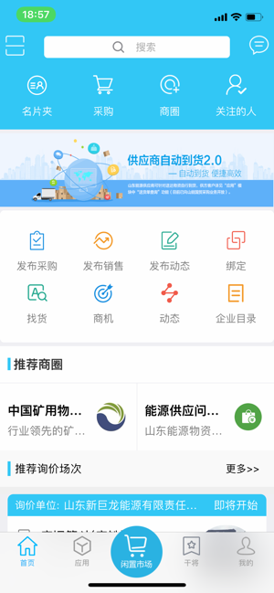 干将供应链APP是为工矿行业打造的一款移动平台,以突出供方客户价值及行业特点为设计理念,通过竞价、拍卖等方式,实现用户与用户,用户与物资之间的互联互通、关系强化,在循序互联网之“联接”本质的基础上实现供应链各节点价值的充分挖掘和商业价值。