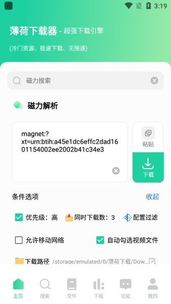 薄荷下载最新版是一个很实用的下载工具,功能挺多的。它支持各种格式的资源下载,比如视频、音频、电子书等等,还兼容安卓机型,用起来很方便。特别是磁力解析功能,直接复制链接就能下载,省事多了。而且界面友好,操作简单,新手也能很快上手。
