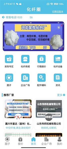 再循化纤圈app是一个化纤行业的交流平台,它是一个把化纤圈,及时沟通,再生pet行业,化纤行业,为一体的手机软件,包含化纤厂销售价格,地区报价,行情分析及市场运行状况,供求信息,让您更加及时了解化纤销售情况。