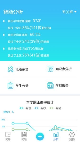 分析:查看布置给学生的作业完成情况、成绩分布情况、与其它班级学校的对比情况、及每道试题的正确率分析对比。