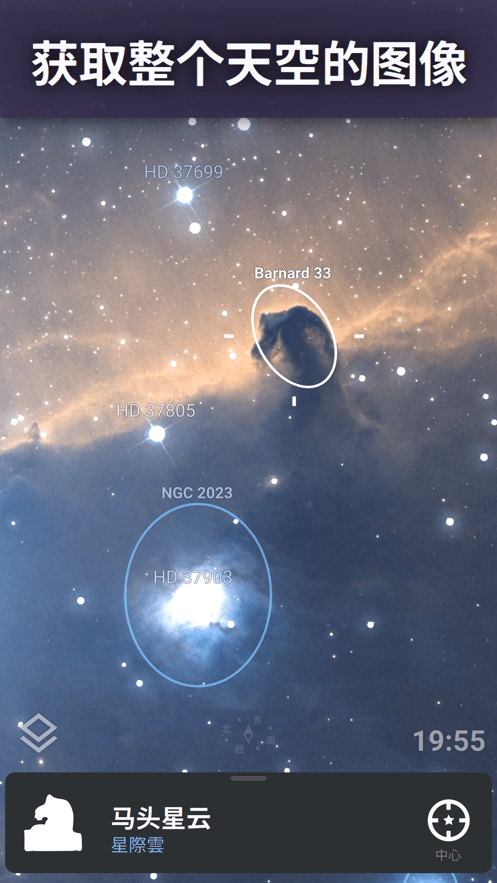 手机探测:打开之后,当上下左右移动手机时,会自动显示当前方位下的模拟星空。
