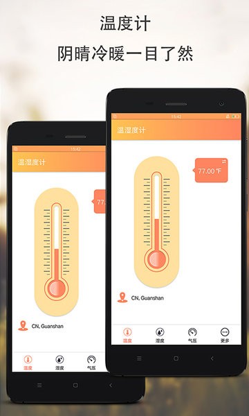温湿度计是一款实用的实时温度计应用软件,通过使用智能手机内置的温度,湿度感测器来实时测量周围环境的温度,湿度和气压,为你提供实时天气的温湿度测量,让你随时随地了解当前天气情况。