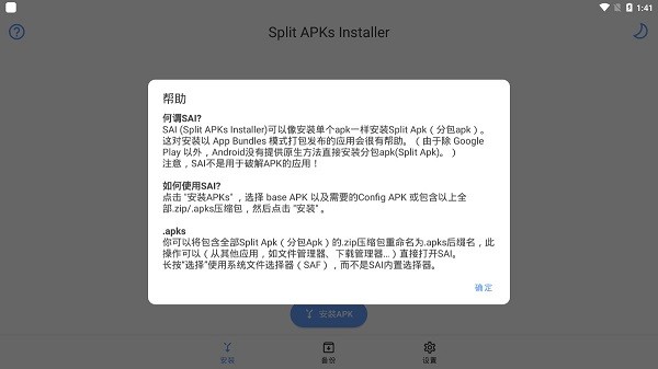 SAI(split-apks-installer)是一个应用程序,它允许你安装多个apk,就好像它是一个包一样。这对于安装作为应用程序包分发的应用程序很有用,因为android没有提供从google play以外的源安装它们的内置方式。