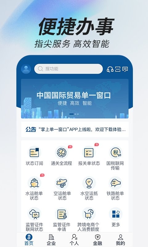 掌上单一窗口app手机最新版是非常好用的贸易管理服务软件,用户可以在手机上查看报关单、水运舱单、空运舱单、铁路舱单的状态,能够进行监管证件的申请,个人以及企业用户均可使用,能够轻松查询行邮税率,办理业务更便捷。