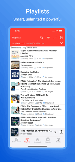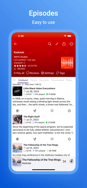 除了作为每日播客缓存器和播放器应用程序外,你还可以在这个应用程序中播放存储在设备上的媒体文件。享受有声书、音乐和其他媒体文件,只需要一个应用程序!