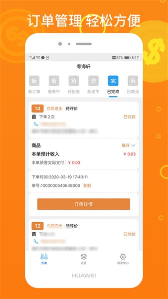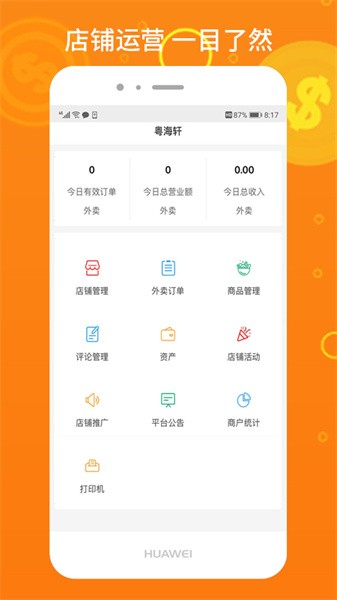 3、经营数据一目了然,包括订单数量、销售收益等信息,高效管理门店运营;