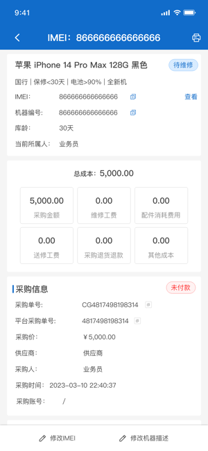 配置符合全场景业务的质检、维修的操作流程,可详细记录机器的质检结果和维修结果、对于维修产生的配件消耗、维修成本工费等信息均在操作同时进行记录。