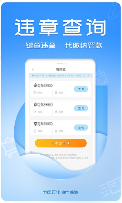 中国石化油中感谢专为广大车主朋友打造,大家可以通过该软件在线查询油价,信息实时更新,让你一手掌握价格变化,同时还提供了线上加油重制、汽车查违章、罚款缴纳等服务,只需要通过实名认证审核绑定名下车辆信息就能使用诸多功能。