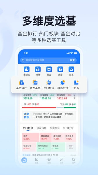 基金排行、热门板块、基金对比等多种选基工具。