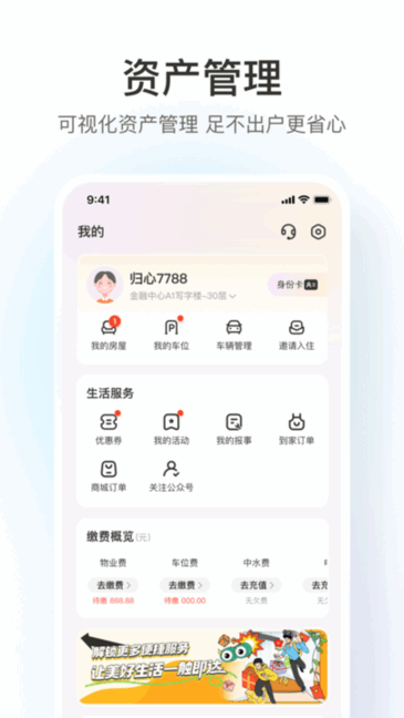 这个应用的核心是线上缴费、报事报修、智慧出行和专属管家服务,覆盖了社区生活的方方面面。它的亮点包括首页焕新、全面服务、优选推荐以及资产管理等功能,用户可以轻松找到所需的服务。融创归心还推出了到家服务、臻选商城、房屋租售等更多生活场景,致力于为业主打造安全、智慧、幸福的社区。