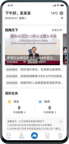 招商随行最新版本是一款服务招商局集团的办公软件,融合了消息、任务、办公协作应用等丰富功能,作为招商局的数字化工作协同平台,致力于实现团队、知识、业务、设备的全面连接。