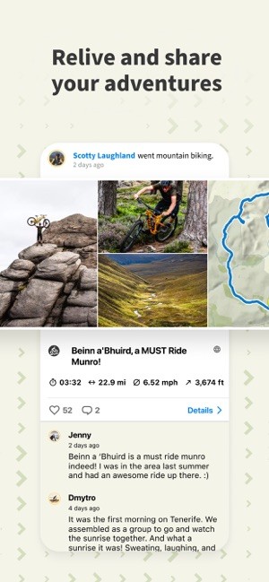 使用GPS追踪您的骑行和徒步旅行。添加照片、精彩片段和提示,建立自己的个人冒险日志,永远存储您喜爱的体验。将它们保存起来供私人使用,或与komot社区分享,以获得点赞和评论,并激励其他户外爱好者。跟随你的朋友和志同道合的探险家,跟上他们的户外探险。