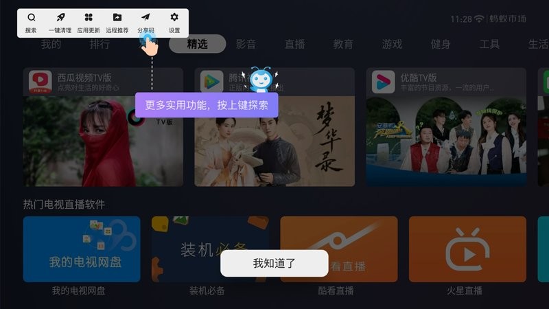 1.在电视上安装蚂蚁市场(各机型安装教程可以在官网社区查看)打开蚂蚁市场,找到分享码页面。