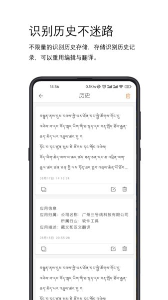 用了一段时间后,我发现它的OCR识别功能真的很强大。只需要打开相机或者相册里的图片,就能快速识别出藏文,并且翻译成中文。历史记录也很方便,每次翻译的内容都会自动保存,还能重新编辑和复制,省去了很多麻烦。