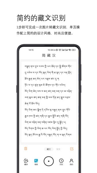 简藏汉app是一款提供藏文语言中文互译的翻译软件,界面简约设计,精准识别,单页操作十分简单,一步即可完成一次图片转藏文识别,轻松转换藏文汉文,提供历史记录,可以在线编辑,交流更加方便简单,十分顺畅,满足您的翻译需求!
