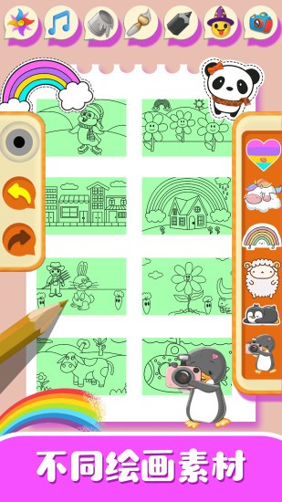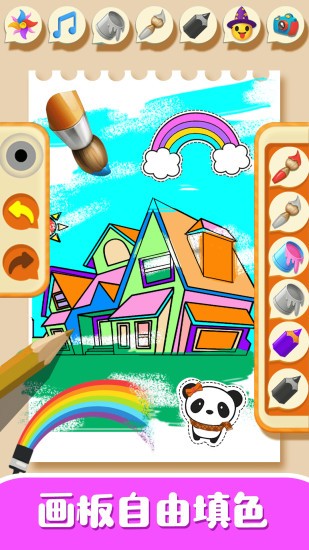 2、着色是这样的,上排从左往右是这样的:回到主菜单、变换背景颜色、音乐、填充整一块、画笔(需要拖动才能画)、铅笔、贴纸、截图、删除、放大。右边是画笔颜色调节;