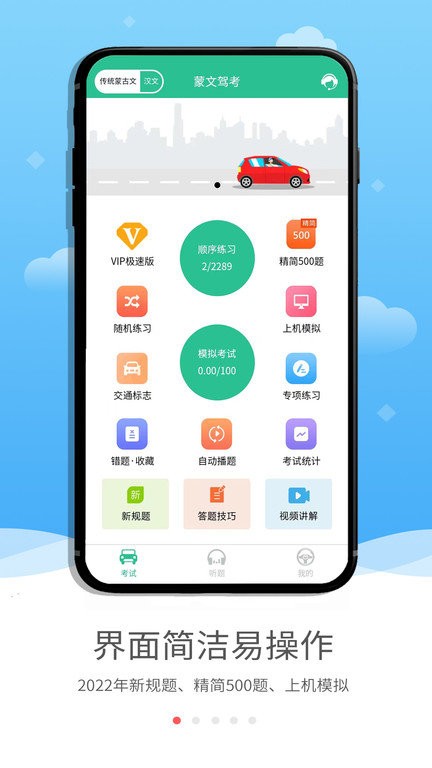 蒙文驾照考试是一款适用于蒙古人员使用的驾考app,支持蒙汉双语版本,提供丰富的题库练习随你刷,精品课程可以在线学习,智能答题,各种交通标识、基础知识一手掌握,快速记忆,助力大家轻松通过科目一到科目四的考试,顺利上岸!