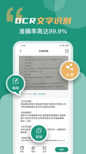 3、支持ocr智能文字识别,拍照扫描识别,将图片转化为可编辑的文字。
