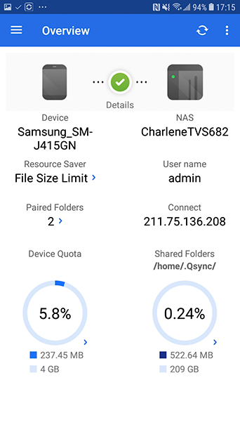 -- 在概览屏幕上查看已同步的移动设备和 NAS 的连接详细信息。